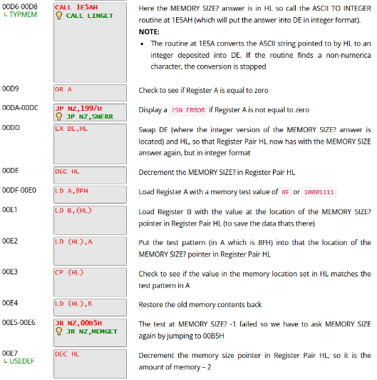 Un moyen aisé de vérifier que cela se passe bien est de valider lorsque le TRS-80 affiche MEMSIZE ? en relisant la ROM décodé on peut remarque qu’il procède à un cycle d’écriture/relecture de toute la mémoire et s’arrête lorsqu’il constate une erreur.