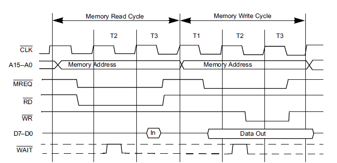 La lecture mémoire issue du TRS-80 utilise des signaux adaptés du Z80 qui est son processeur. Nous avons vu rapidement plus tôt comment ce passait une lecture mémoire voici maintenant l’ensemble des cycles d’accès à une mémoire ou un périphérique externe.
