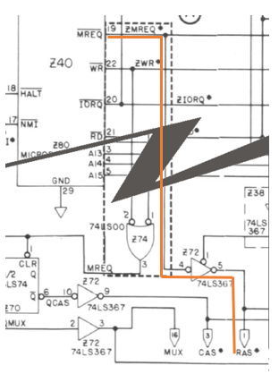 On remarque, en revanche, sur le schéma du TRS-80 que ce dernier utilise néanmoins ce signal afin d’élaborer les signaux de gestion l’accès à la mémoire dynamique dont le bus d’adresse est multiplexé. Ce signal qui est en fait le même est renommé utilisé pour la sélection des colonnes.